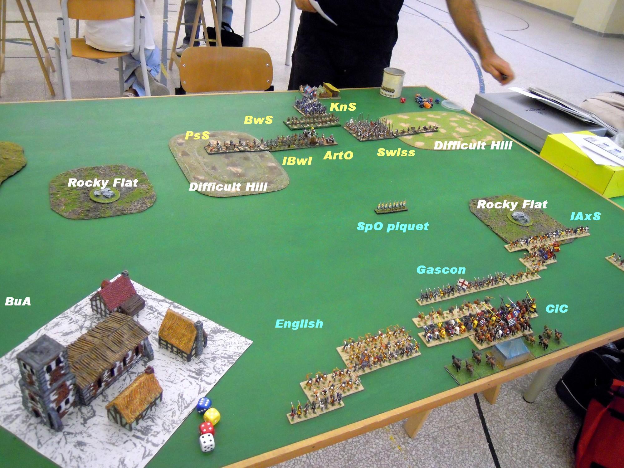 With the mounted BwS uncommitted, I kept IKnS in reserve, and attacked the infantry supporting the ArtO. The French seeing the determined attack by the English and gascon corps, changed his plan recalling the RKnS ti support the Swiss sent to engage my BdS. The BwS were finally sent around my left flank.