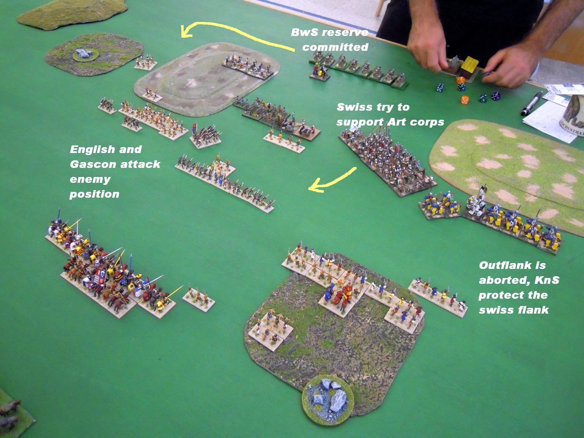 The Swiss blocked part of the gascon advance towards the artillery battery. The swiss BdX sallied from behind the phalanx to cover its flanks. In the meantime english BwS were hacking the francs archers. To speed up the attack I exposed the BdS flanks, suffering two hard flank attacks by the french IBwI and surviving.