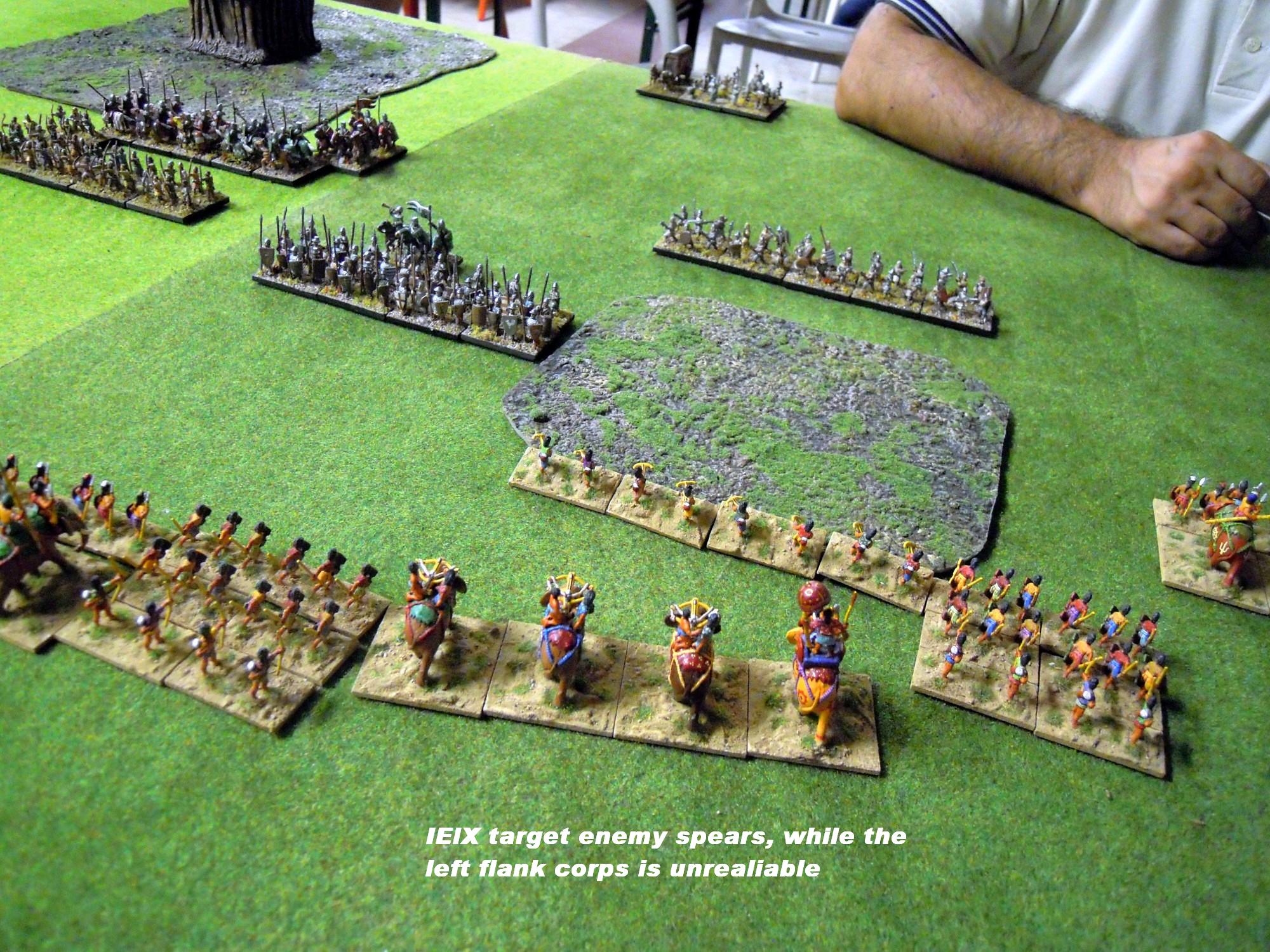 The left corps turned to be unreliable. I advanced hard the right wing, while the CiC center wheeled to acquire some target for my artillery