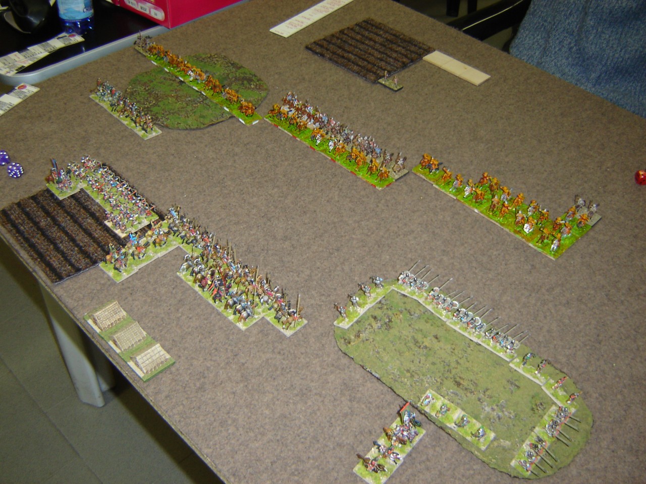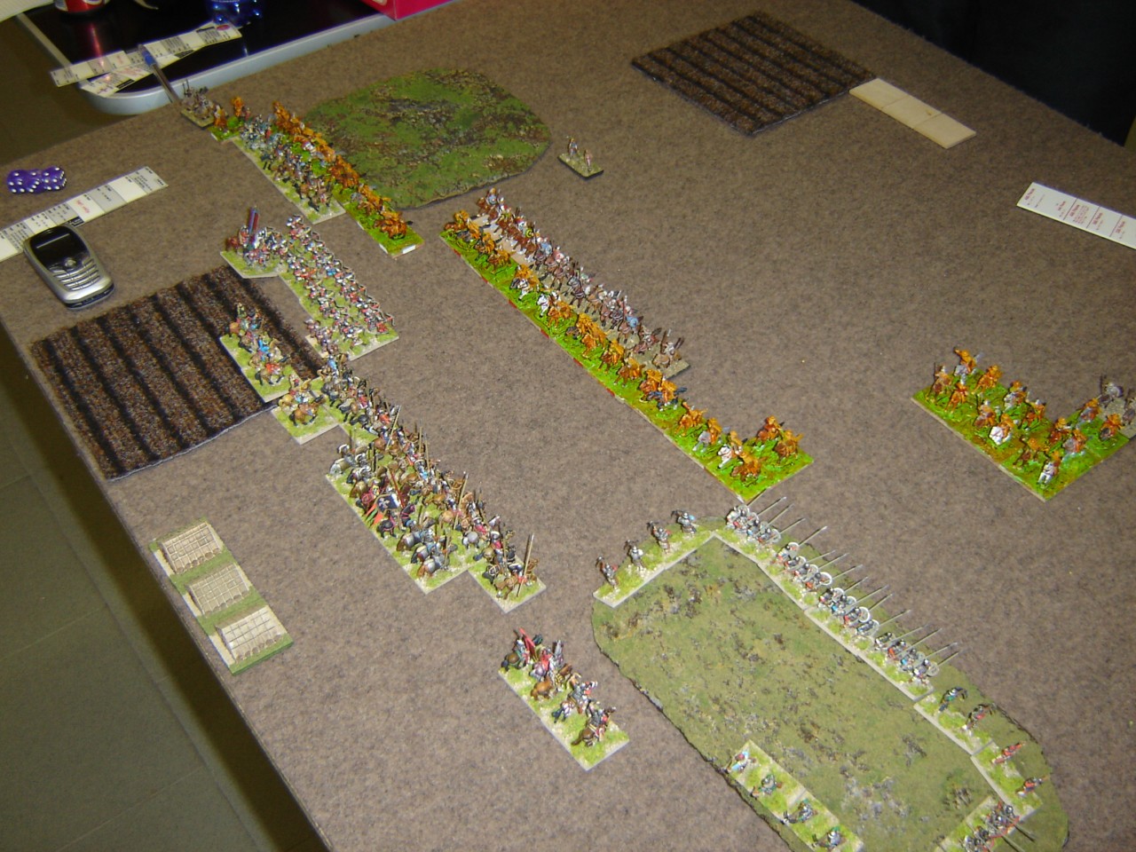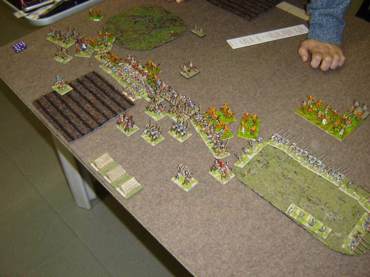 Again I defended and I had some terrain to cover the flanks: a rocky patch on the left and a difficult hill on the right. My AxI were quite happy to hide in the hill, being near to useless in open going. The rest of my army deployed deep. Alans had a large host of Lhs shielding the nobles IKnF in the center.