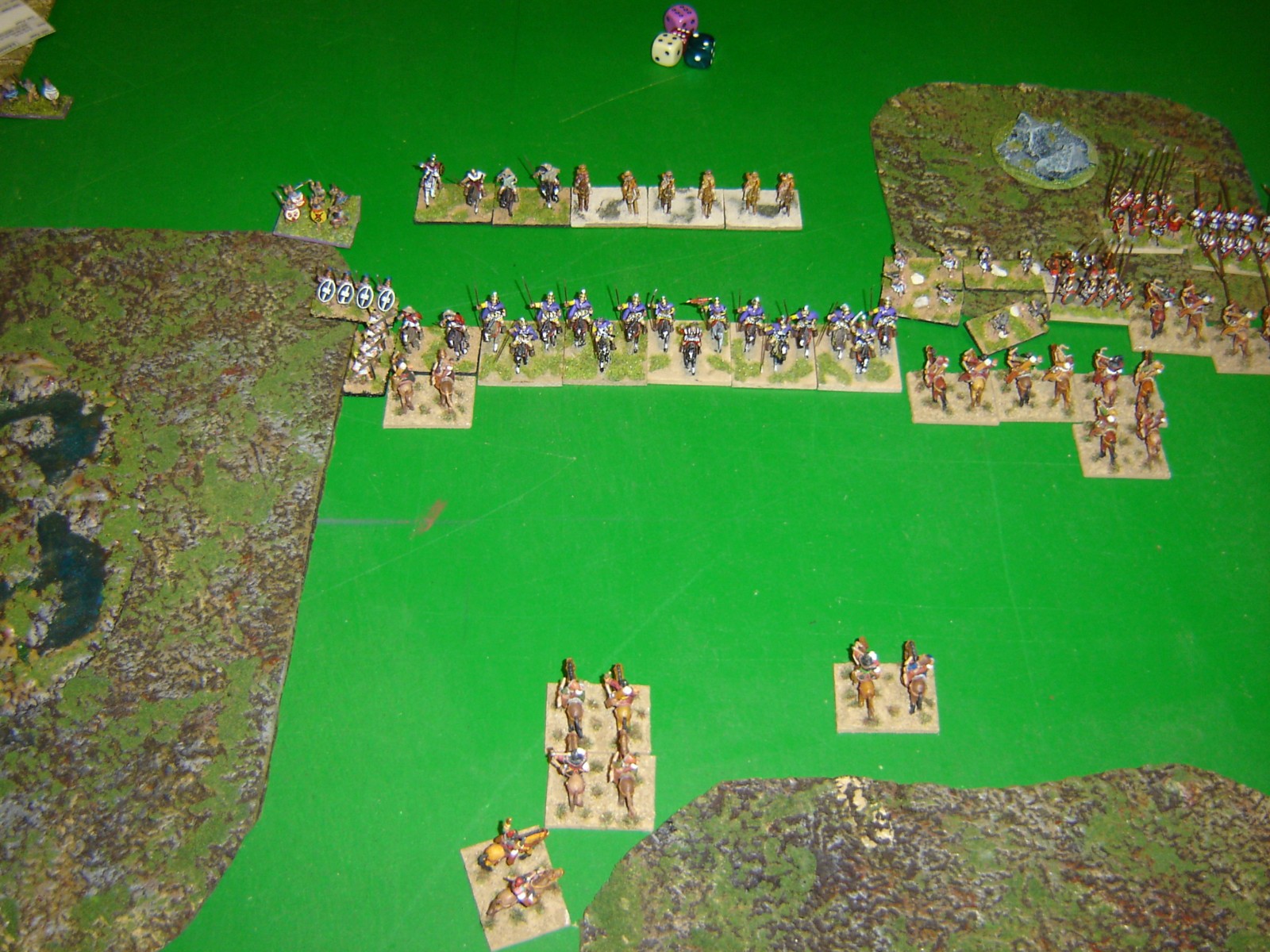 The armies deployed. My CiC corps was on the right to gain advantage from the bonus pip. The Selucid had a Cv corps supported by 1 El, PsS and Lh on my right, a PkS phalanx 2 deep in the center, and 5 KnF wedges on the left, supported by 8 AxO and more Lh. A very weak army I thought. I was going to change idea soon.