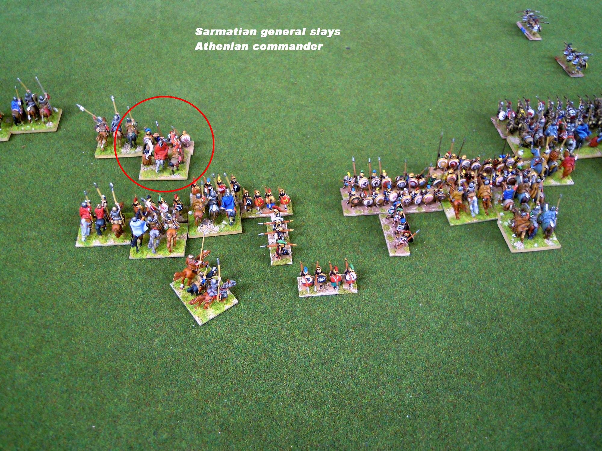 With many gaps appearing in the line, one sarmatian general was able to charge the athenian commander and kill him.