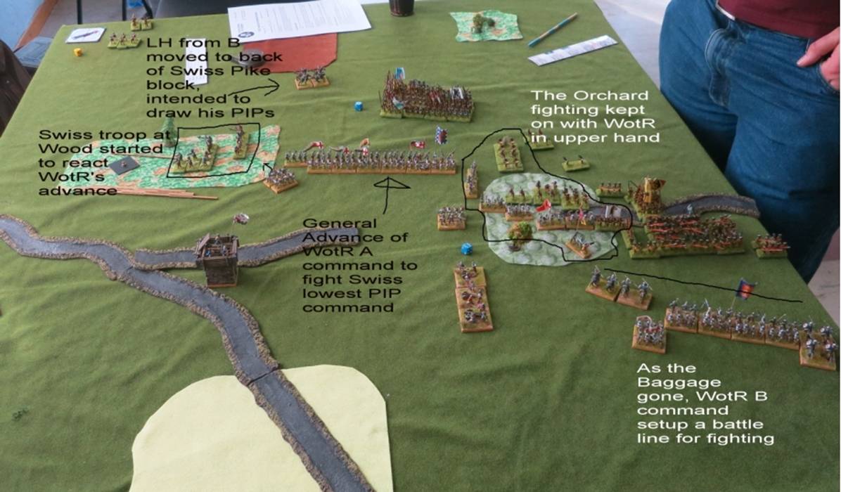 The WotR Bowmen inside the Orchard had repulsed several attacks of the Swiss handgunner (RPsS). Despite Bowmen were not for DG fighting, their combat factor would be the same as that of Psiloi there. They were superior quality troops and their shooting ability enable them to fight as well as RPsS in DG. Moreover, the Swiss had only committed their smallest ME command. It is just 10ME. It ended up that this Swiss Command was broken and WotR had occupied the Orchard firmly. Now it was the time for the WotR to counter-attack.