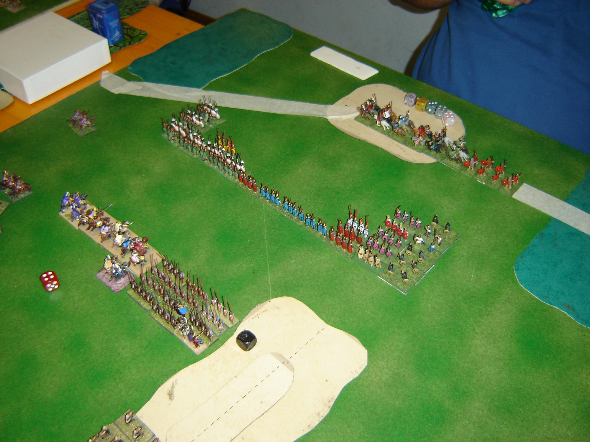 The Pergamene army attack the Galatian few troops on the table, while the gauls wait for the massed infantry sent on a flank march. The galatian cavalry will be wiped out but the pergamene will have no time to countermanouver and finish off the enemy army. 15-10 to Pergamene