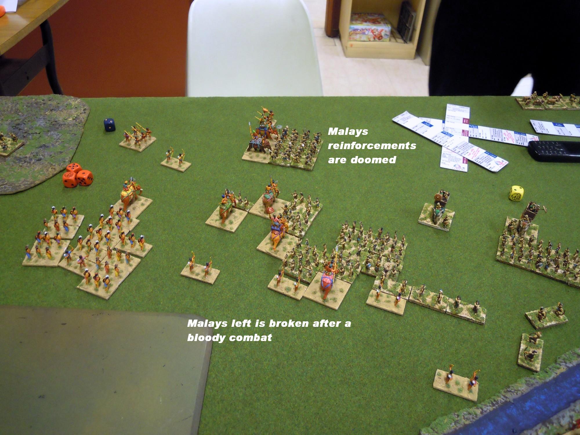 The Elephant charge was successful but costly. Both the armies had very few pips, and this in the end was an advantage to Siamese that could keep contact with the enemy, while the malay could not exploit several opportunities to hard flank the nellys. My center was disheartened and risking to be broken.
